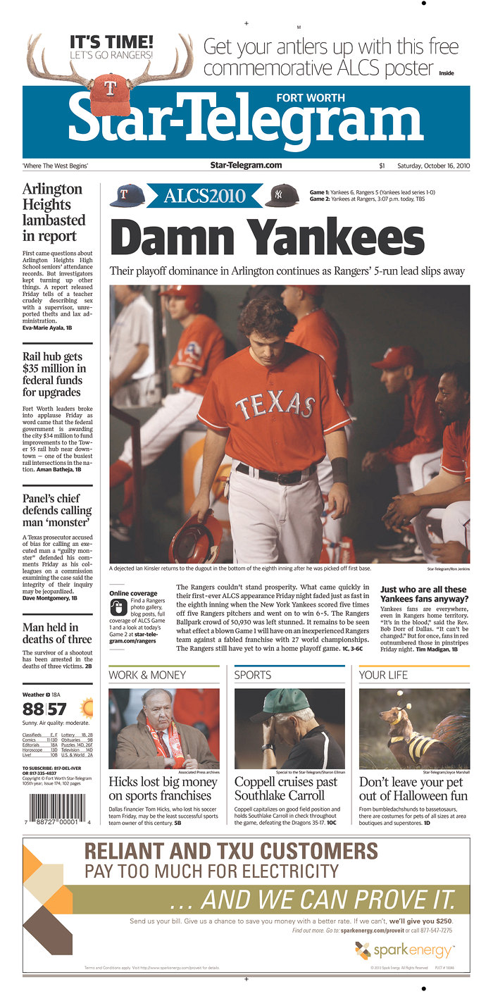 I'm not sure whether a board has to vote or if there's a way to just fast-track it, but last night's Yankee game has to be declared an Instant Yankee Classic on YES Network. It is as easy a decision as Ron Washington bringing in his closer in the 8th inning last night...oh wait. There are even better visuals from last night and make sure to check out Rebecca's post from This Purist Bleeds Pinstripes to see them. Mostly courtesy of Newseum, here are the front pages: